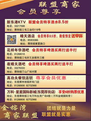 金榕湾商家联盟是跨行业联盟。联盟商家本着互惠互利,资源共享,友好合作的原则,联合有实力,信誉度高及具有行业代表性的商家,整合行业外资源,共同为消费者提供优质服务。凭会员卡可以在各联盟商家享受打折、特色服务等优惠。 12月1日,万科·星星国际影城、真功夫餐饮连锁隆重加入, 强强联手打造东莞商盟界航母! |