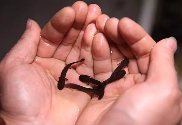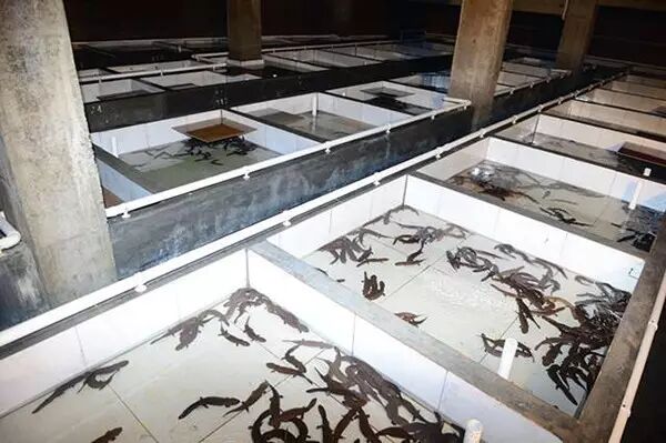 来到孙生官的娃娃鱼养殖基地,走进一个个黑漆漆的房间里,只听见流水声,还能感受到一阵阵清凉。用手电筒的灯光一照,原来房间里都是用水泥砌成的一个个小水池,而水池里养着的全是娃娃鱼。这些娃娃鱼有的近一米长,有的则还是鱼苗,当这些娃娃鱼感觉到灯光时,便开始后退。孙生官告诉我们,娃娃鱼喜欢低温、阴暗、潮湿的环境,养娃娃鱼一定要细心,勤观察,熟悉它的生长习性。