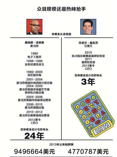 但另一方面,施瓦茨也面临着巨大挑战,而且这挑战可不止如何确保洗手间的抽水马桶光亮洁净这么简单。他是这家连锁快餐企业自1954年创建以来的第21位首席执行官。公司曾先后五次易主,多年来饱受东家冷落以及发展战略缺乏连贯性之苦。施瓦茨几位前任的主要竞争对手只有麦当劳和Wendy’s,到了他这里,老对手依然在,而他同时还要防止顾客流向Chipotle Mexican Grill和Panera Bread等新同行。据快餐业咨询公司Technomic的数据,后面这两家公司去年在美国市场的销售额分别增长了17%和12%。相比之下,汉堡王及其两家老对手的销售增长一直表现平平。