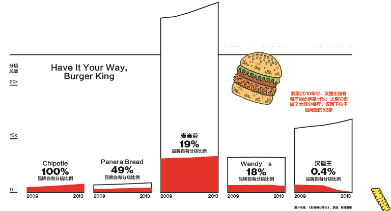 施瓦茨督导执行了大量削减成本的动作(他拒绝就本文接受采访)。以2013年的统计,在全球35429家麦当劳餐厅中,麦当劳自有的占19%。Wendy′s旗下6557家餐厅的自有率为18%。汉堡王以往的情况与它们非常类似。2011年3G Capital公司刚买下汉堡王的时候,其全球12174家餐厅中有11%是自营。收购完成后,汉堡王出售了绝大部分餐厅,只留下52家自营,用于为其品牌培训管理人员及测试新品。