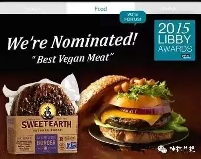 【图:甜蜜地球的纯素汉堡获2015年Petal LIBBY奖 “最佳纯素肉”提名】
