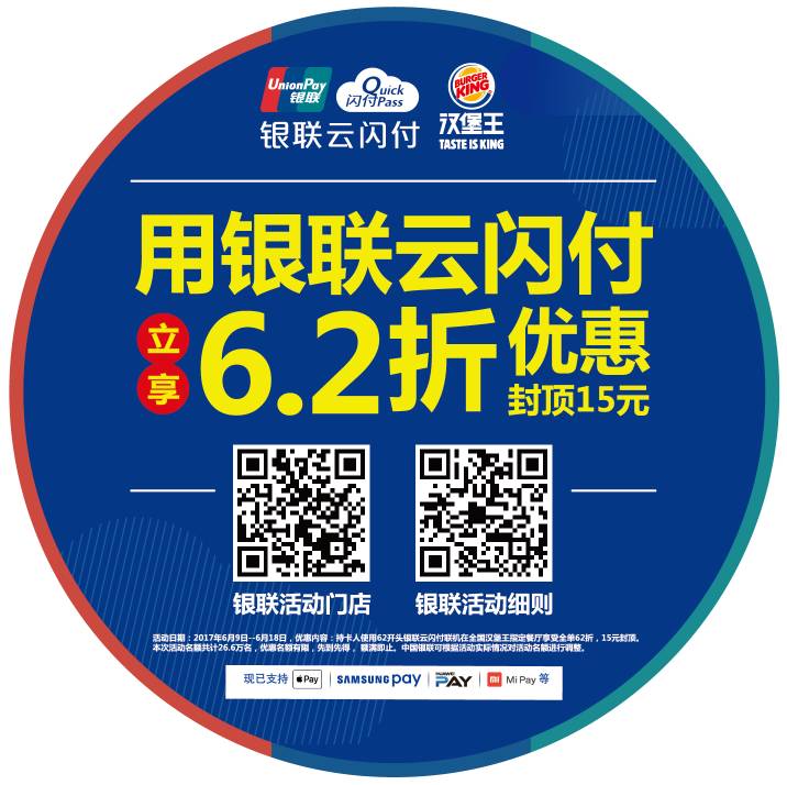 1、用户在活动门店使用银联闪付(带闪付功能的银联卡)以及云闪付的联机交易(包括Apple Pay、Huawei Pay、Mi Pay、HCE支付、银联IC卡非接支付以及可穿戴设备支付)支付,即可享受6.2折(最高优惠15元)。