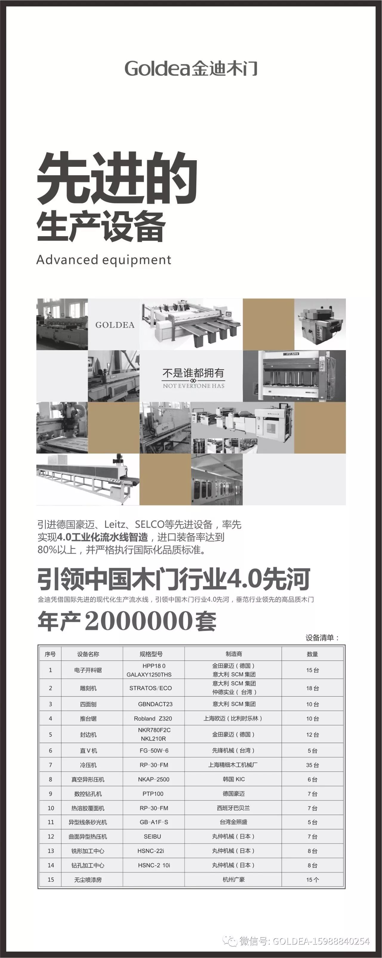 在生产设备上,金迪木门更是引领中国木门制造4.0时代的潮流,全线引进德国豪迈生产线,拥有德国豪迈封边机、数控钻孔机以及意大利SCM开料锯、雕刻机、四面刨等百余台国际先进设备。制作工艺则严格执行国际化品质标准,保证了每一扇金迪木门都有好品质。