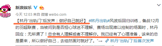,广告商撤资的消息也慢慢散去,对于林丹来说,满城风雨的尴尬境地已经过去了。所以在出轨事件后,他并没有停止工作。包括这段「无所谓,反正有人不理解」的言论,也出自训练时。