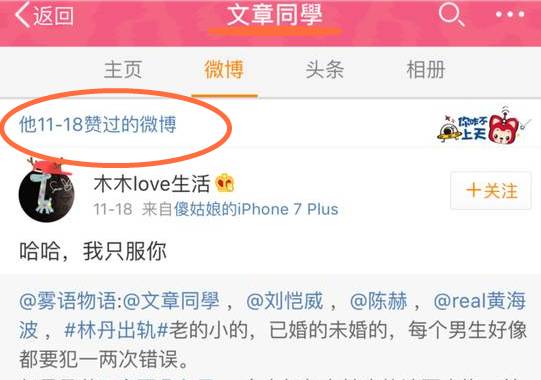 林丹出轨后第二天,文章还在相关微博点赞,也难怪网友把二人联系在一起