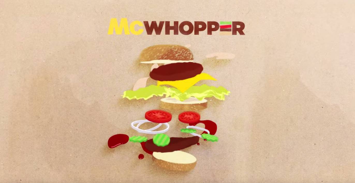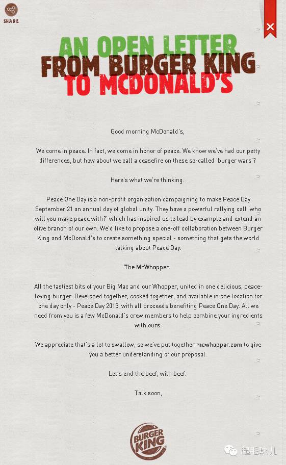 “我们停火吧,拿你们的巨无霸牛肉堡和我们的皇堡,我们一起做个MCWHOPPER怎么样?”