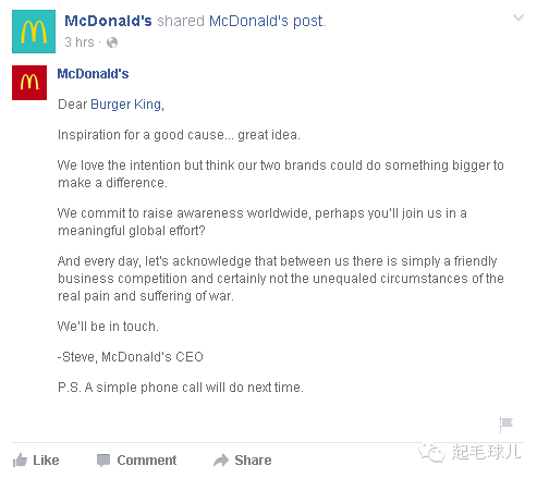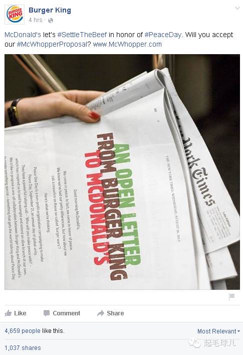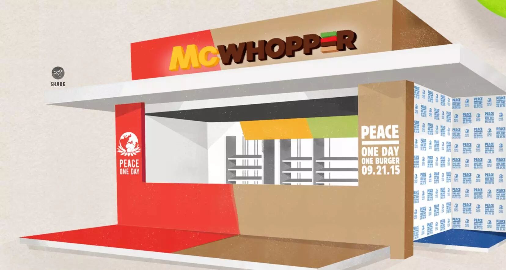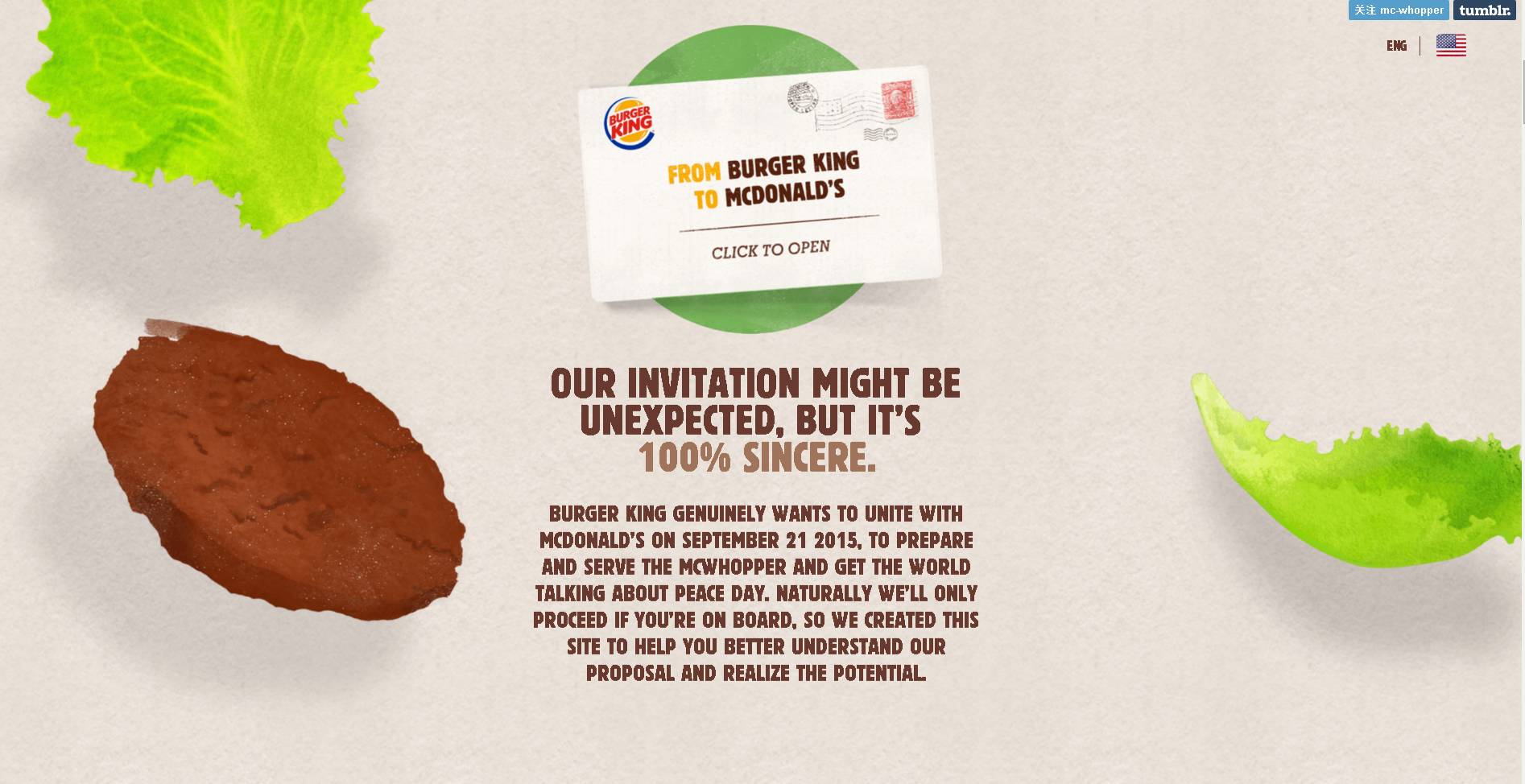 “麦当劳,为了纪念即将到来的PeaceDay,让我们一起放下‘牛肉(堡)战争’。你会接受我们的#麦皇堡计划#吗?www.McWhopper.com”