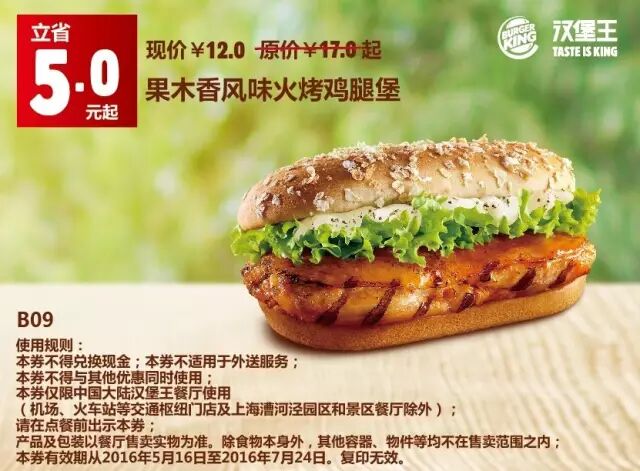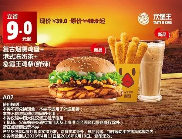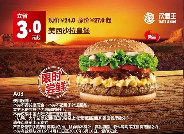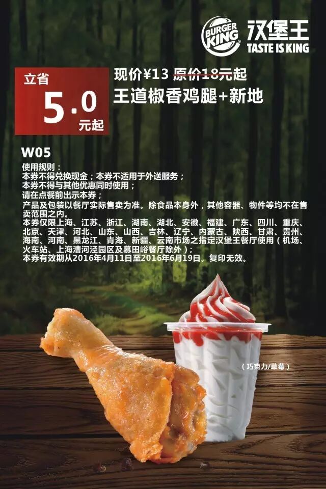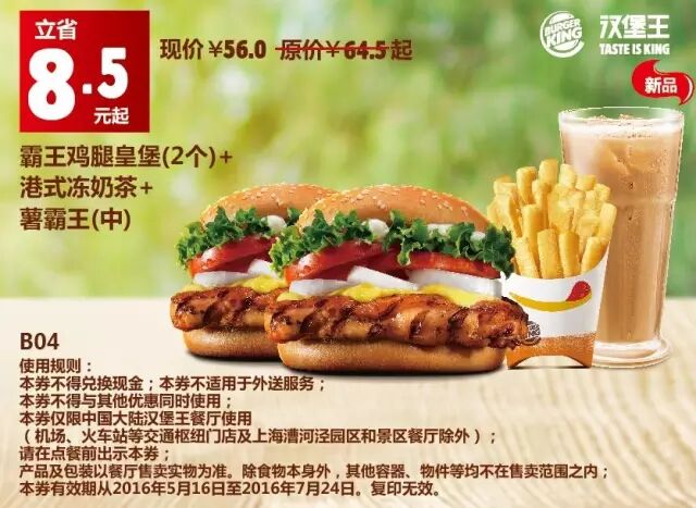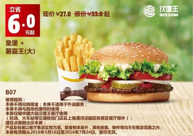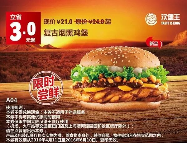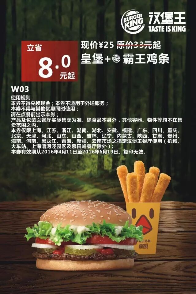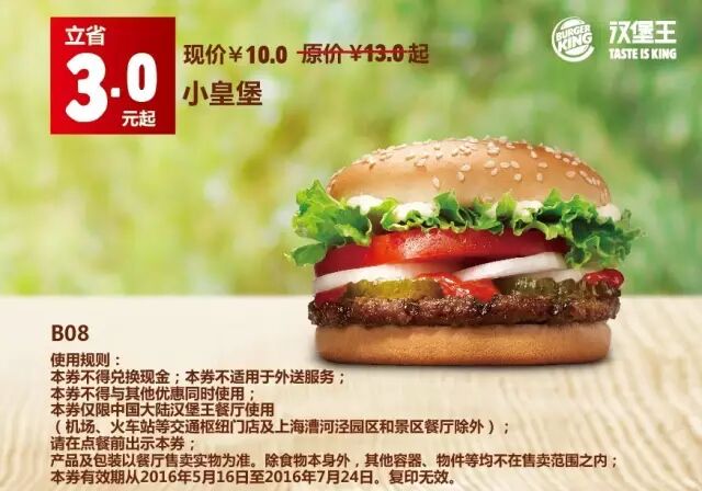 1.本券仅限全国汉堡王餐厅使用