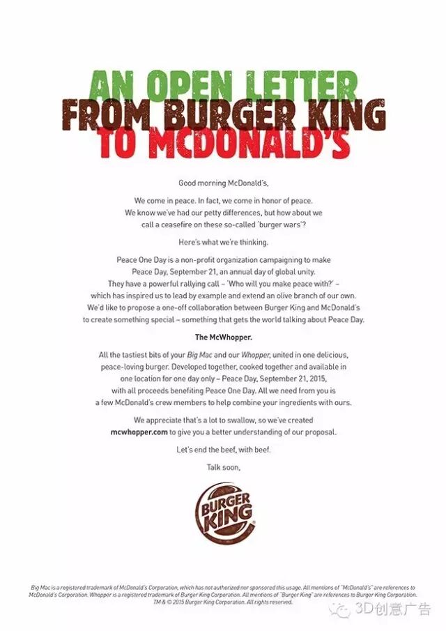 然而麦当劳总裁SteveEasterbrook在Facebook委婉拒绝,并称之为“了不起的构想”,他说到两大品牌可以采取更大的动作对世界和平贡献力量,而汉堡王或许愿意加入麦当劳从事更有意义的全球活动。
