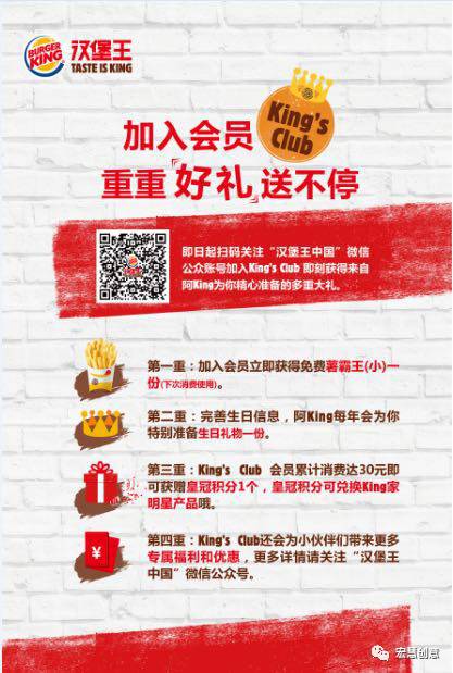 扫码关注“汉堡王中国”微信公众账号加入King’s Club ,即刻获得来自阿King为你精心准备的多重大礼。