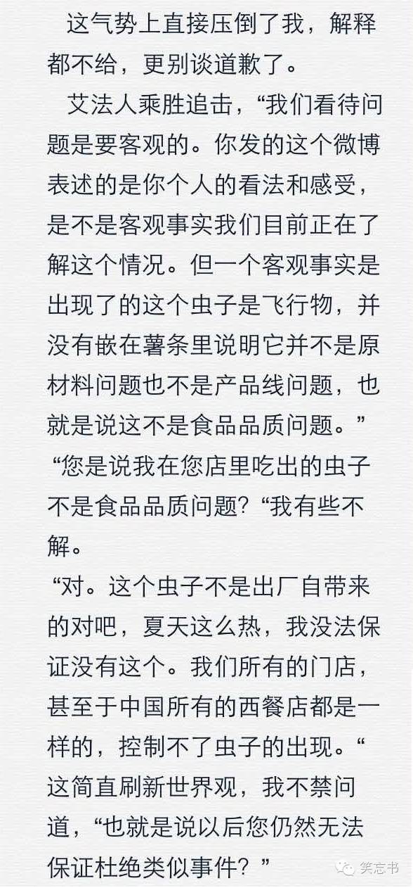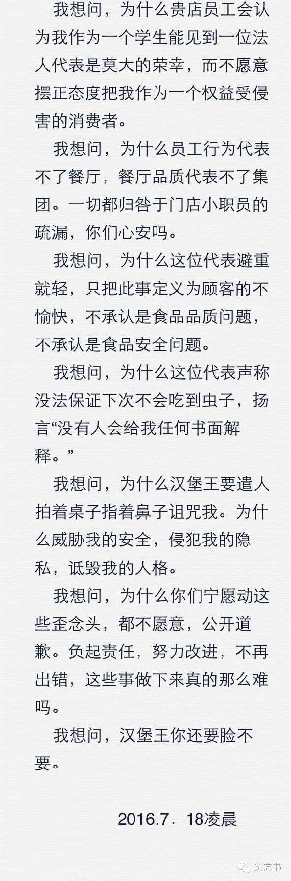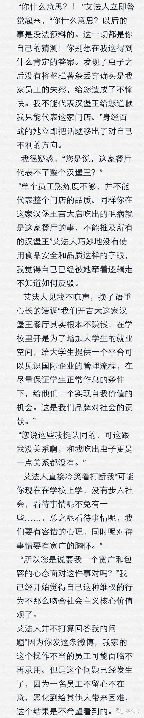 一个自称是法人的经理艾丽斯首先拒绝书面道歉,其次否认吃出虫子是食品安全问题或食品质量问题,并无法保证日后不会出现此类事件。并且声明不能代表汉堡王道歉,只能代表门店道歉。