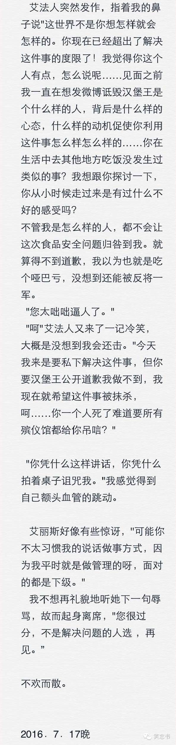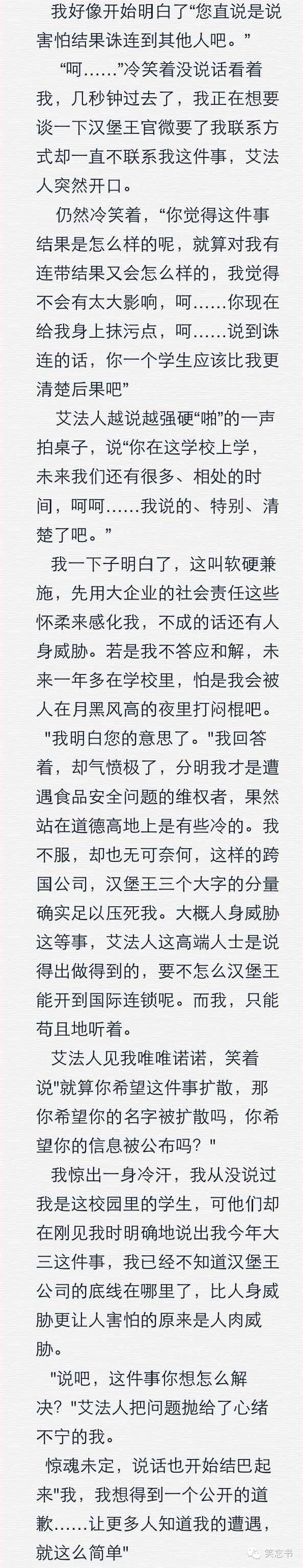 随后艾经理抛出汉堡王品牌对社会的贡献试图感化当事人(招聘学生,让他们实现自我价值,见识国际企业的管理流程),又说要有容错心理,宽容对待此事。最后就放大招,人身威胁,,雇佣水军等等。