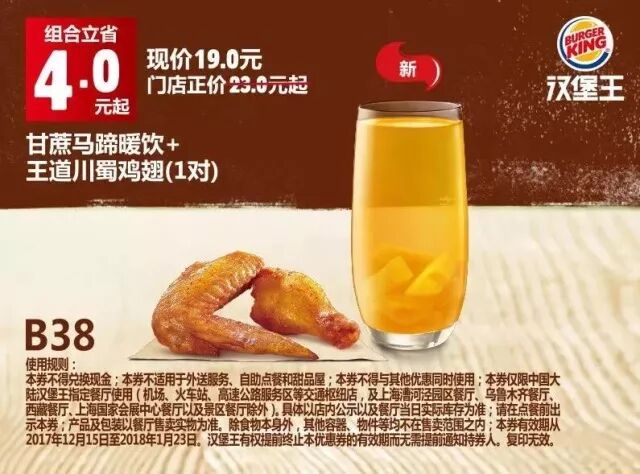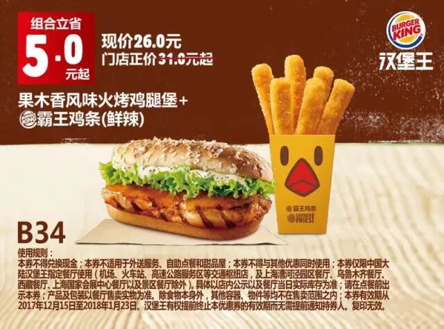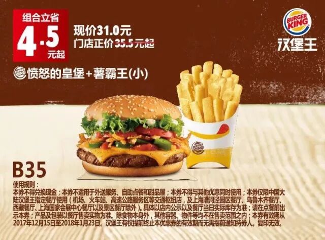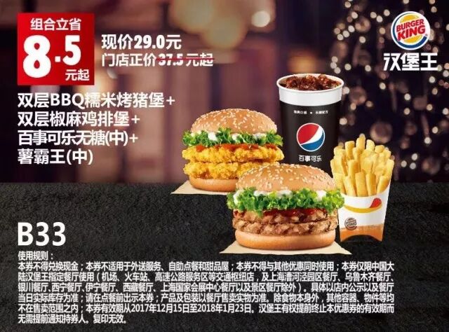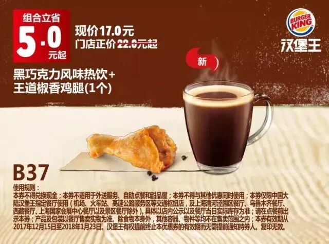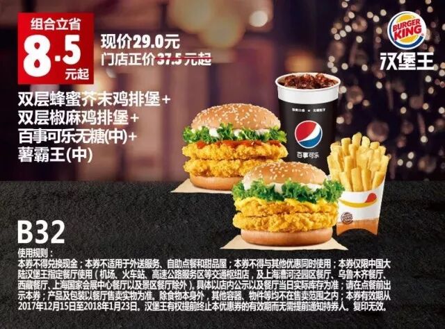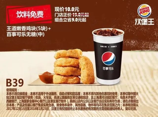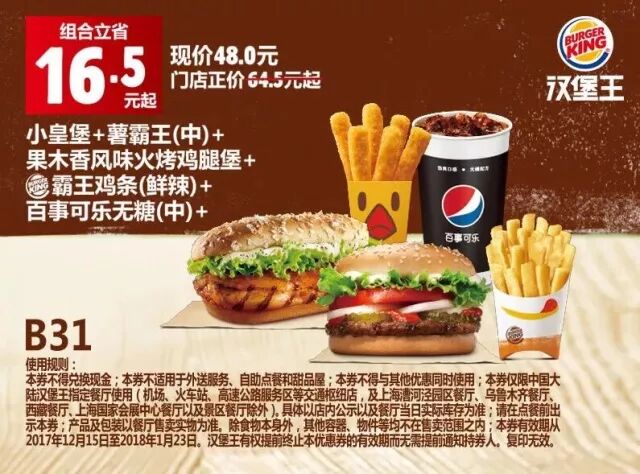 本券仅限中国大陆地区汉堡王指定餐厅使用(机场、火车站等交通枢纽门店,以及上海漕河泾园区餐厅、新疆市场及景区餐厅除外)