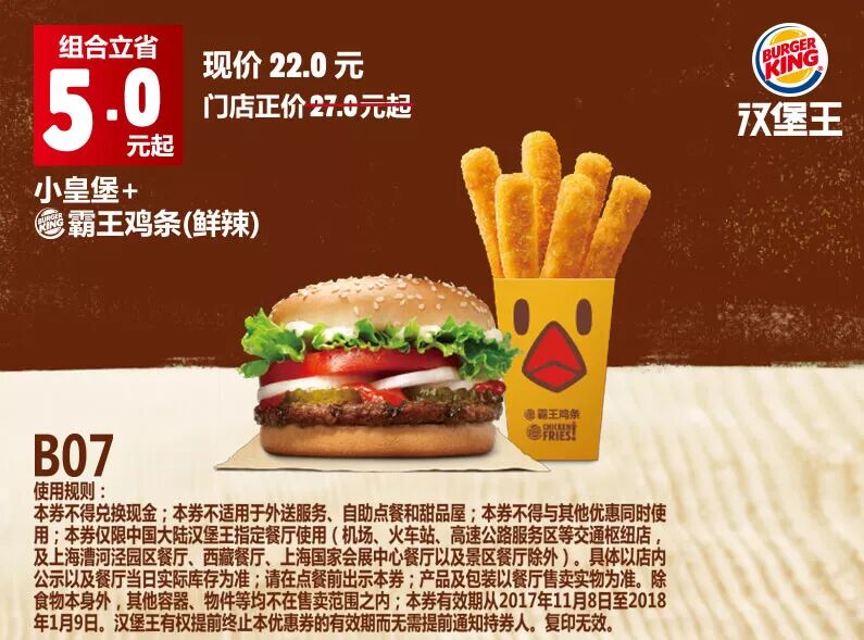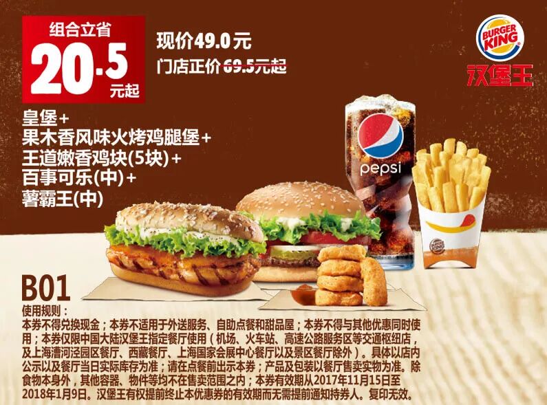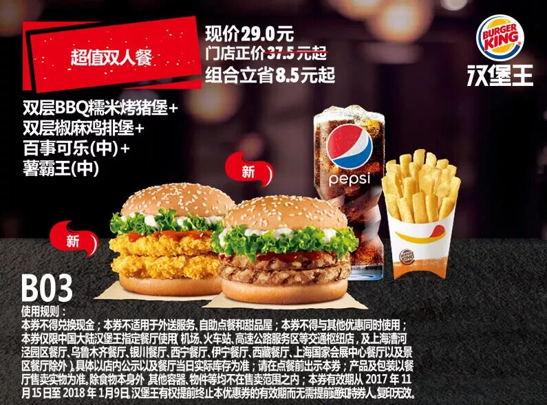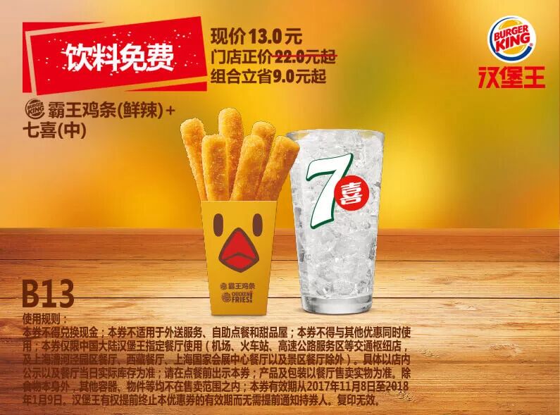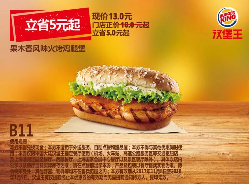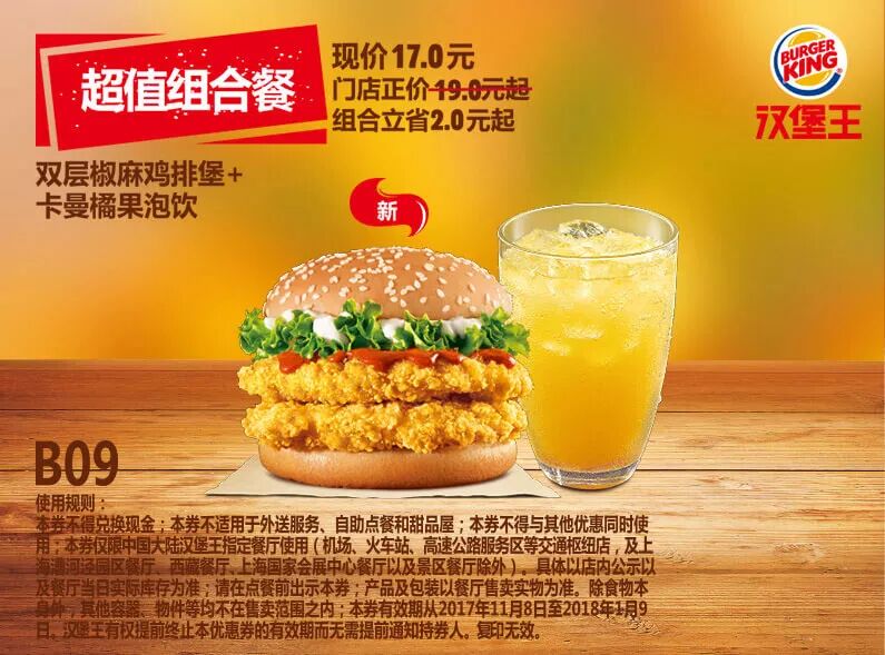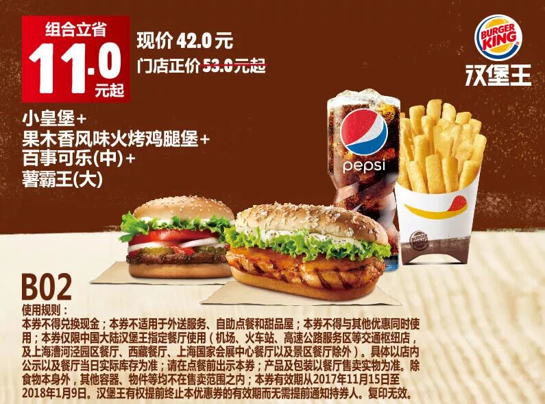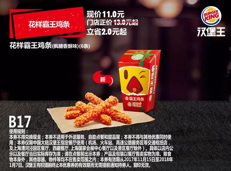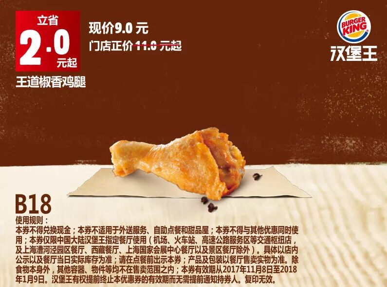 本优惠券不得兑换现金;本券不适用于外送服务、自助点餐和甜品屋;本券不得与其他优惠同时使用;本券仅限中国大陆指定汉堡王餐厅使用(机场、火车站、高速公路服务区等交通枢纽店,及上海漕河泾园区餐厅、西藏餐厅、上海国家会展中国餐厅及景区餐厅除外),具体以店内公示以及餐厅当日实际库存为准;请在点餐前出示本优惠券;产品及包装以餐厅售卖实物为准;除食物本身外,其他容器、物件不售卖范围之内;本券有效期从2017年11月15日至2018年1月9日;