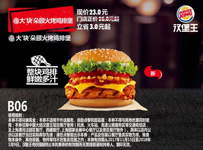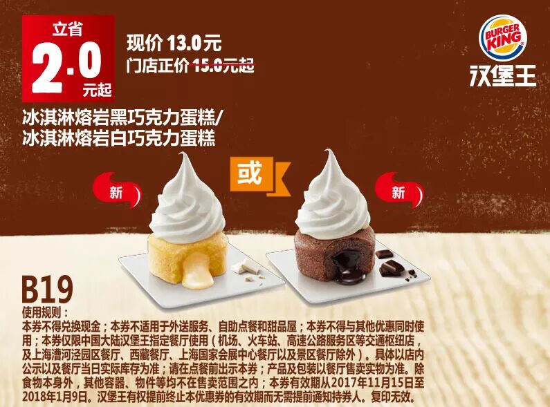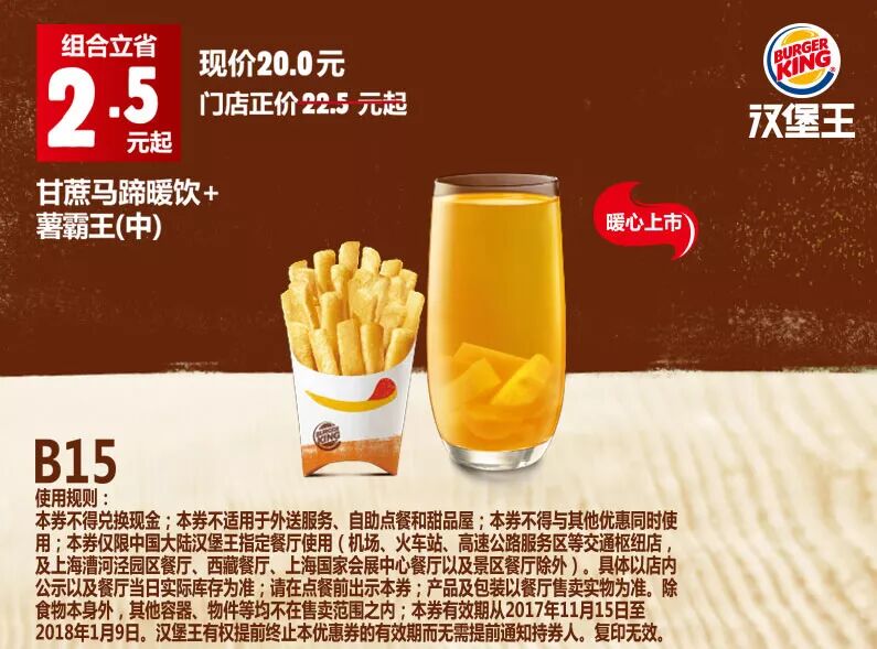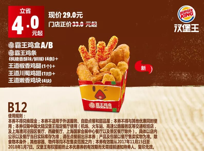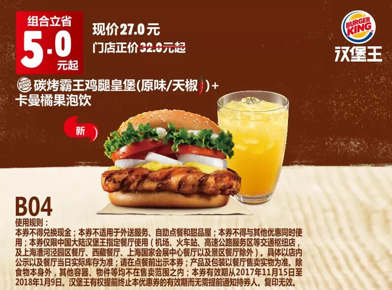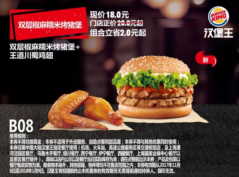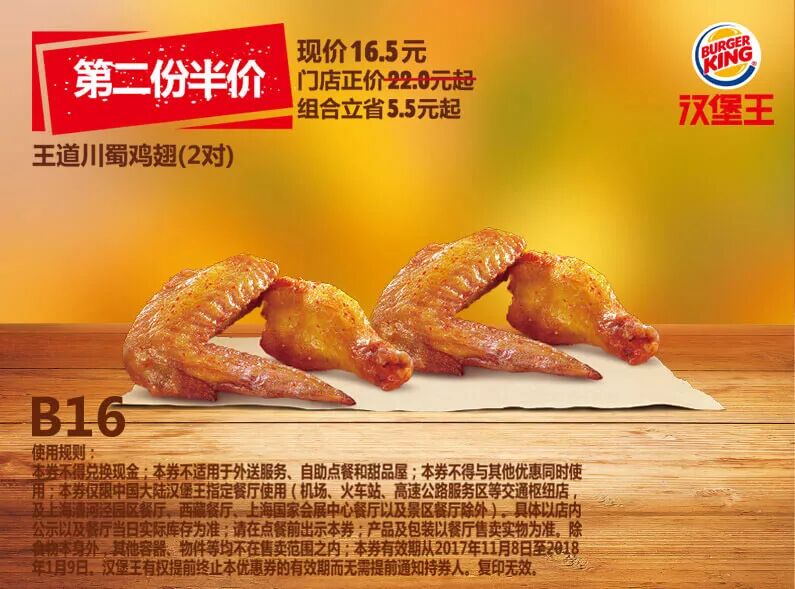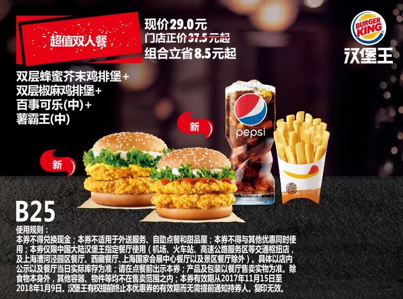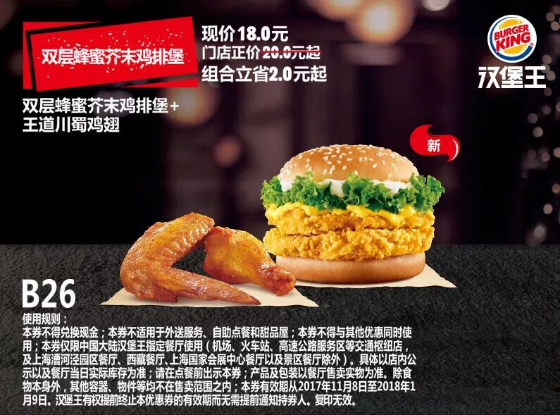 本优惠券不得兑换现金;本券不适用于外送服务、自助点餐和甜品屋;本券不得与其他优惠同时使用;本券仅限中国大陆指定汉堡王餐厅使用(机场、火车站、高速公路服务区等交通枢纽店,及上海漕河泾园区餐厅、西藏餐厅、上海国家会展中国餐厅及景区餐厅除外),具体以店内公示以及餐厅当日实际库存为准;请在点餐前出示本优惠券;产品及包装以餐厅售卖实物为准;除食物本身外,其他容器、物件不售卖范围之内;本券有效期从2017年11月15日至2018年1月9日;