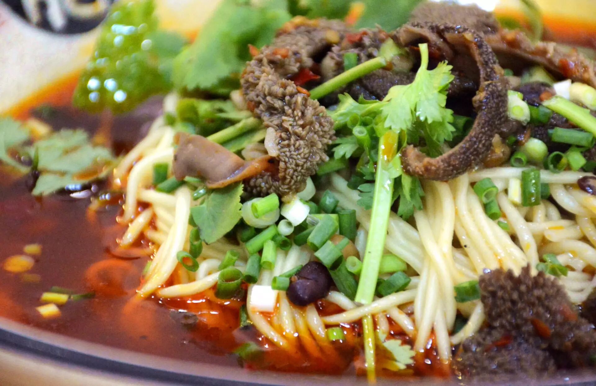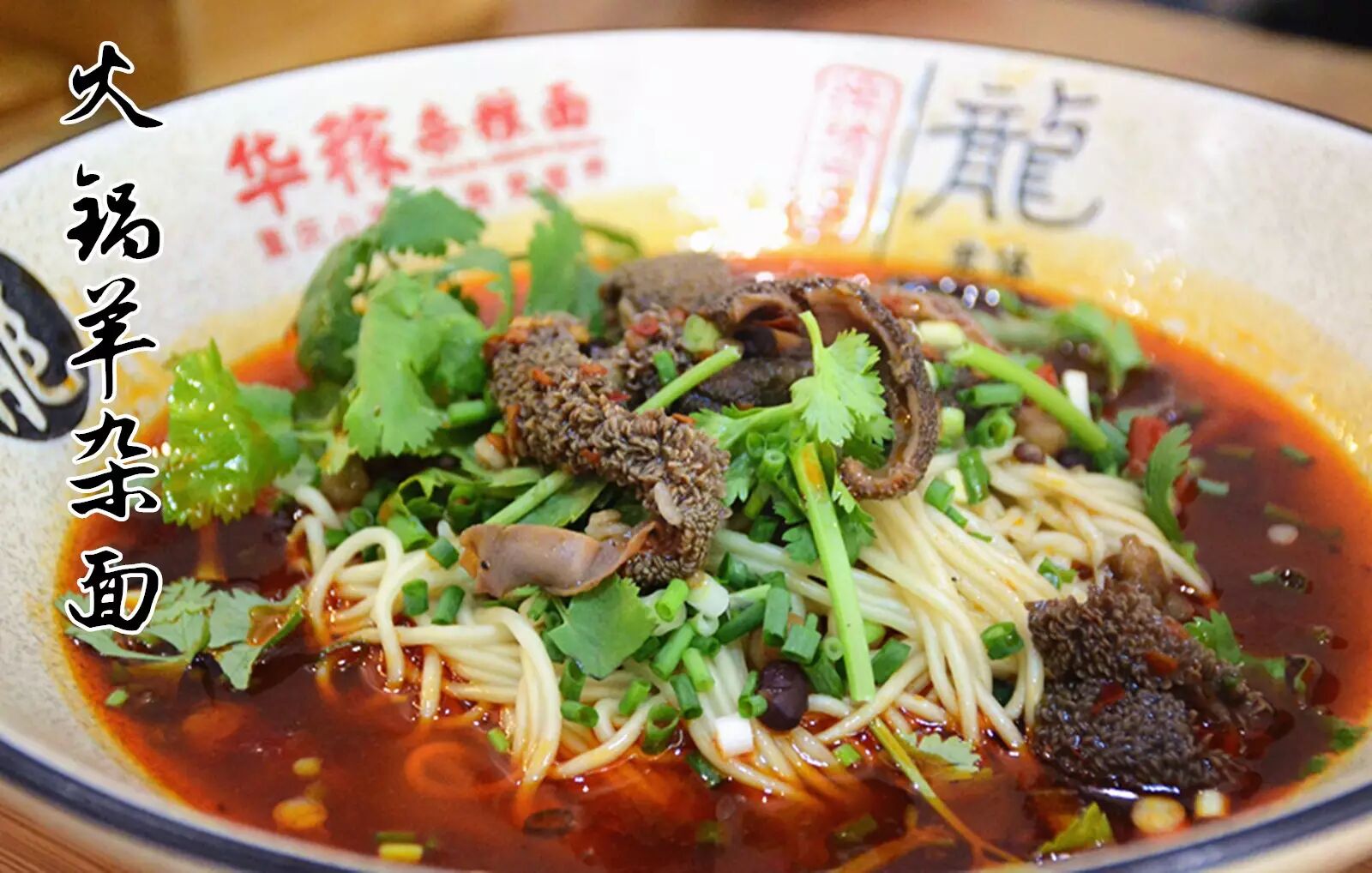羊杂在面汤里滚几下,蘸上油,放入嘴
