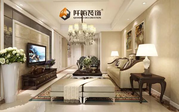 本案选用业主喜欢的古典纹案的金色壁纸铺满整个空间,让古典元素贯穿于居室中。电视背景选用镜面和软包的搭配设计,加上偏现代感的家具和饰品,带来了空间时尚和简洁的感觉,让新与旧、繁与简的融合更加完美。