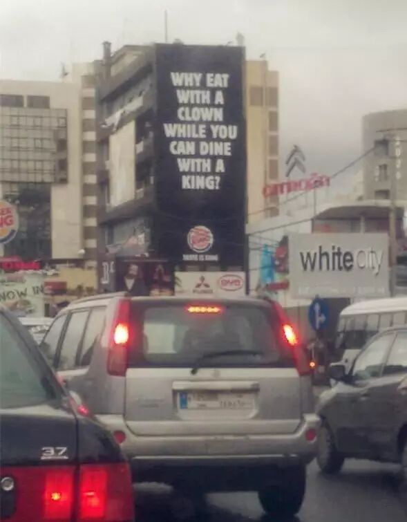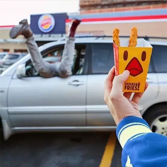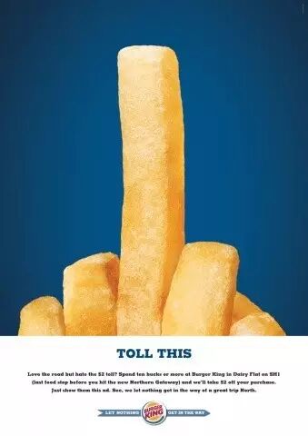 由于司机们常对2美元的过路费产生抱怨,汉堡王餐厅为过路司机提供2美元的优惠抵消过路费。高低不平的薯条形象“竖中指”,向收费站表达愤怒。谁以后不准我吃薯条,我就把这张图发给他~