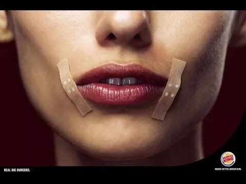 因为汉堡王的汉堡更大,更美味,导致美女都矜持不住,一口闷,把嘴巴都给张裂了。两个创口贴,与美女的红唇对比,简单明了。