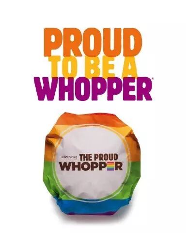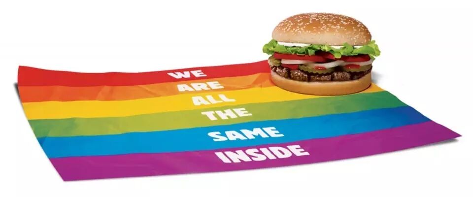 在第44届旧金山同志大游行中,汉堡王力挺同志,推出Proud Whopper骄傲皇堡套餐。最开始,汉堡王并未透露彩虹汉堡的口味,当同志们点完餐打开包装纸后,会看到“我们内在都一样”的标语,戳中诸多“同志”的泪点。同时,与汉堡王刚换的新标语“By Your Way(忠于你的口味)”相呼应。