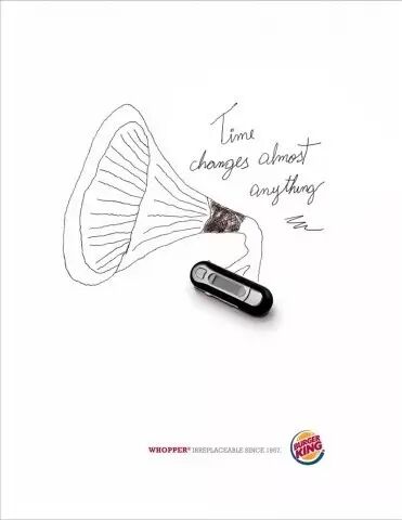 从黑胶唱片到MP3、到电视机、到手机,时间几乎改变人们生活中的所有物件。从这个时间跨度,汉堡王的美味一直都在,熟悉的味道并将永远陪伴你,品牌的力量立现。