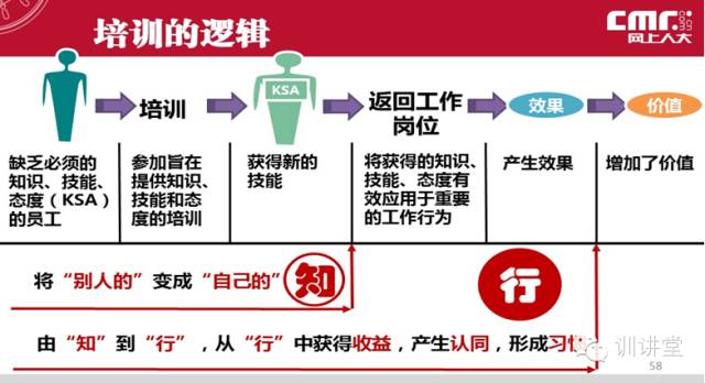 我答:首先告知他们做内训师不仅仅是授课,而是建立内部人脉关系的最短路径,中国人有一日为师终身为夫的说法,做老师等于在组建自己未来的团队;其次要让他相信做内训师是另外一种管理,很多道理和工作通过课程讲出来的效果比单纯指挥有效。(史述龙:还有另外一个含义:骨干员工通过授课可以梳理自己的工作思路,同时进行强化,在讲解的过程中还能触发另外的灵感。)