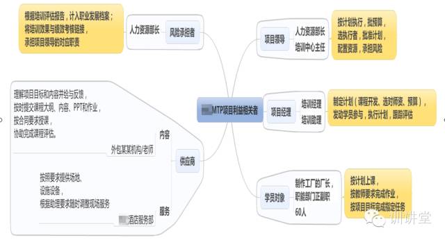 我答:首先定义所谈培训工作是属于规划类还是项目执行类;如果是规划就需要决策者、执行者和受益者的参与;如果是具体的培训项目,那就首先要画出项目的利益干系人,并从中界定出关键人,互动的基础是申明价值!