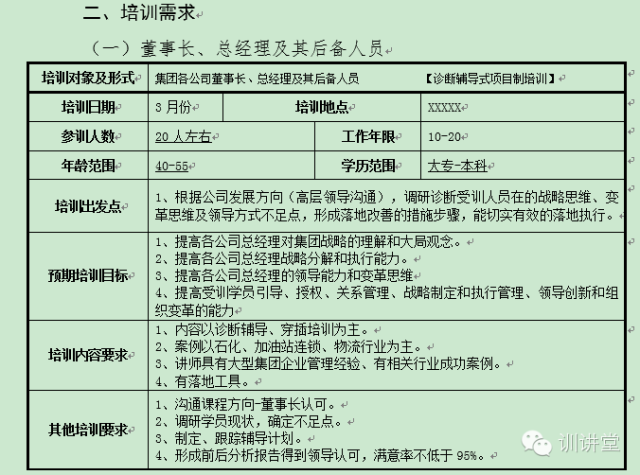 5、在其他培训要求中提到“沟通课程方向—董事长的认可”。请问董事长对这个总经理级别的人员培训有没有心目中的结果、要求或者判断标准,或者说他在哪些重要讲话中有提及到?能不能给培训机构提供?