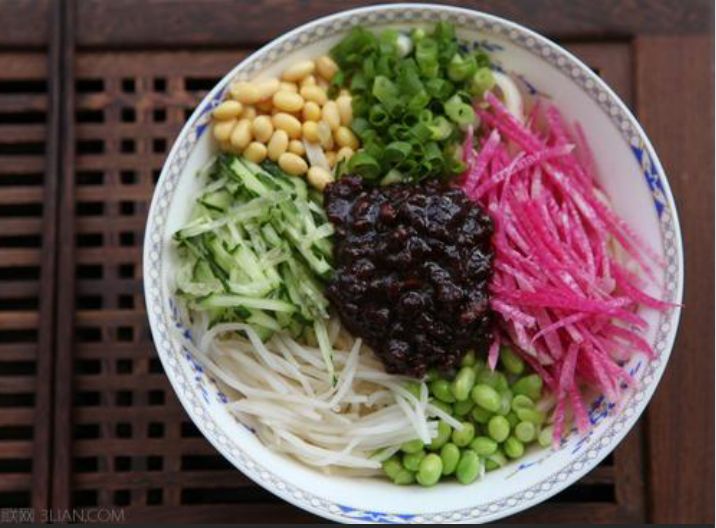 下面我就要说说老北京的炸酱面了。其实做老北京炸酱面方法很简单,热锅热油,姜葱炝锅儿,五花肉切丁儿就可以了,当然吃老北京炸酱面还得讲究小碗儿炸酱。但关键在于菜码儿。至于菜码儿那讲究和将就那区别就大了去了。讲究的主儿,黄瓜,青蒜,黄豆,青豆,心里美萝卜,豆芽,芹菜,豆角等等数不胜数。要是家里没有这种条件,这菜码儿有一种也行了。那也许您要问了。那菜码儿不就是蔬菜吗,这还分什么条件不条件?嘿嘿!这要是放在夏天秋天都好说,在那困难的年代数九隆冬,心里美萝卜大白菜在哪里都好找,其它的东西您去找找试试!就是您找的到可您吃的起吗?所以说别看就是一碗炸酱面,这讲究和将就可就有了天壤之别了。尤其是那黄瓜,那可是吃面条不可缺少之物。数九寒天的弄条黄瓜别说吃,您就是放在面板上一切那种清香之气马上弥漫在屋子里令人陶醉。不过那是在以前,如今的黄瓜浇的不是化肥就是打的农药,您不用说切上一条,就上您踏烂了黄瓜地保证您身上也沾不上一点点那旧时的黄瓜味儿。