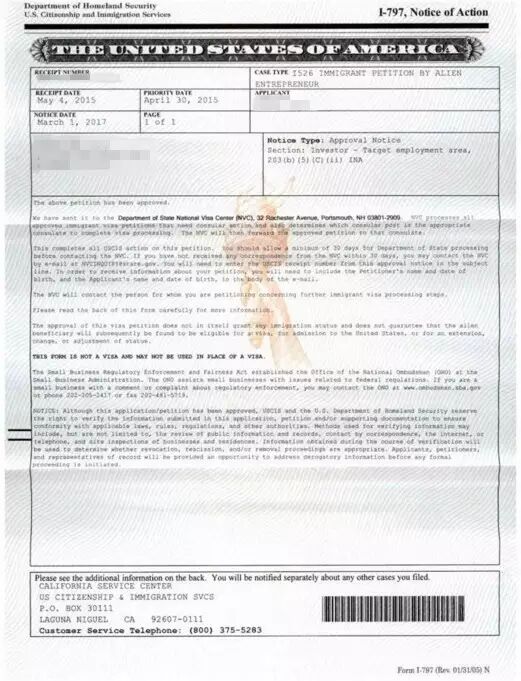 迈斯林移民集团不负所托,助力客户于2017年3月初成功拿到国移民局的I-526批准!