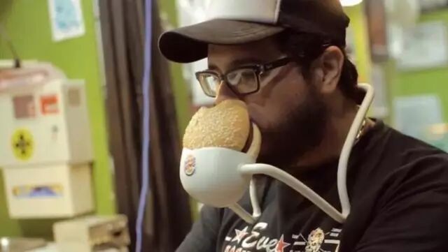 看上去就像是一个L造型的挂架,有一边的横架上面有个扁扁的杯子,使用的时候,把整个支架挂在脖子上,汉堡放杯子里,刚好就在嘴巴前面,头稍微朝前伸出就能咬一口下来……