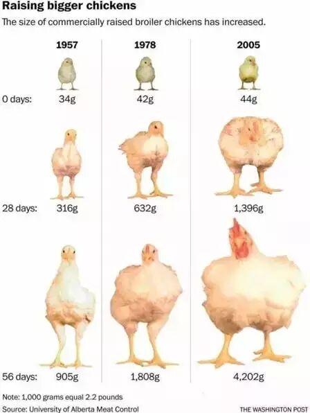 【图:为了养更大的鸡。美国商业养殖鸡1957、1978、2005比较图,分别列出三个时期的刚出生的0天小鸡,以及28天和56天后的体态与体重,令人震惊——我们食用的肉食是畸形的、含激素的垃圾食品!】