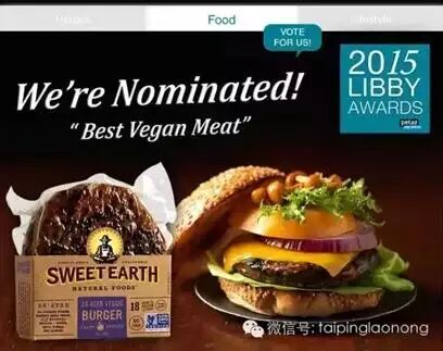 【图:甜蜜地球的纯素汉堡获2015年Petal LIBBY奖 “最佳纯素肉”提名】