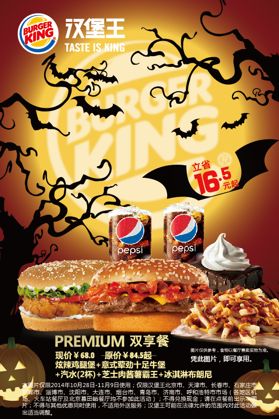 10月28日至11月9日,点购原价84.5元起的汉堡王Premium双享餐,出示上图电子券,即可立省16.5元,享受超值优惠!