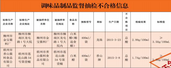 调味品制品抽检项目包括重金属、品质指标、食品添加剂和微生物指标等32个指标,共抽检17家企业的20批次产品,其中18批次合格,2批次不合格。其中一个是柳州市金宝酱料厂生产的白米醋(酿造食醋),不合格项目是总酸,检验结果2.99g/100ml(标准值≥3.50g/100ml)。