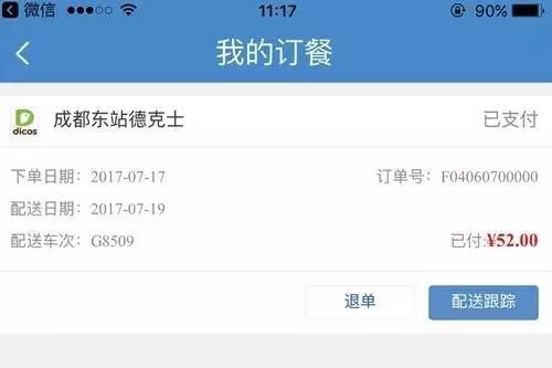 这是用12306的手机APP预订餐食后生成了订单,可退单或者跟踪配送状态。