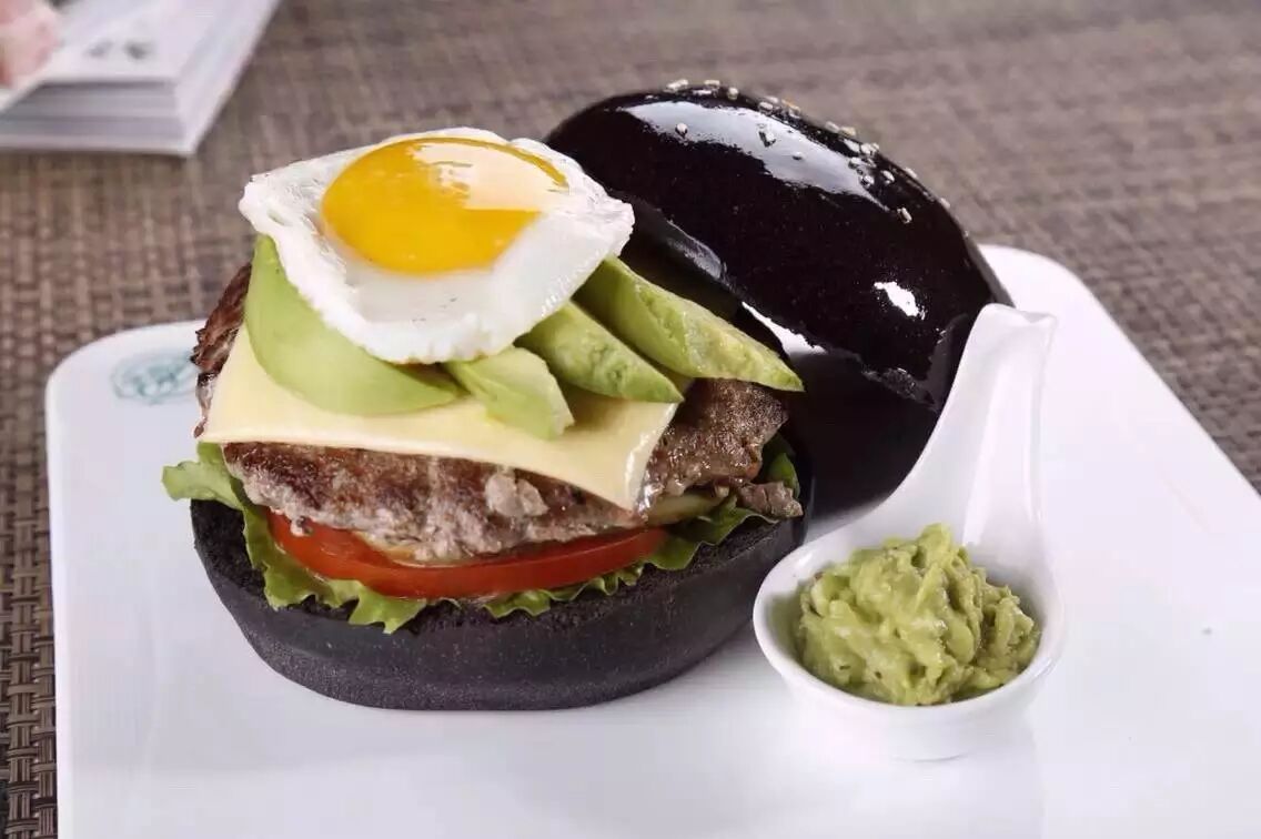 ▲难得一见的黑色汉堡,全郑州只此一家。用墨鱼包做皮,用筋道嫩滑的牛肉饼搭配鲜美可口的牛油果。