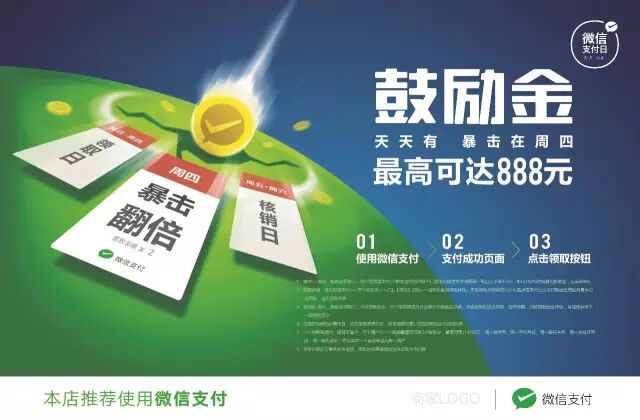 10月9日至11月26日活动期间,每周四为“鼓励金暴击日”,当日使用微信支付,则本周期内累计领取的鼓励金总额将翻倍。