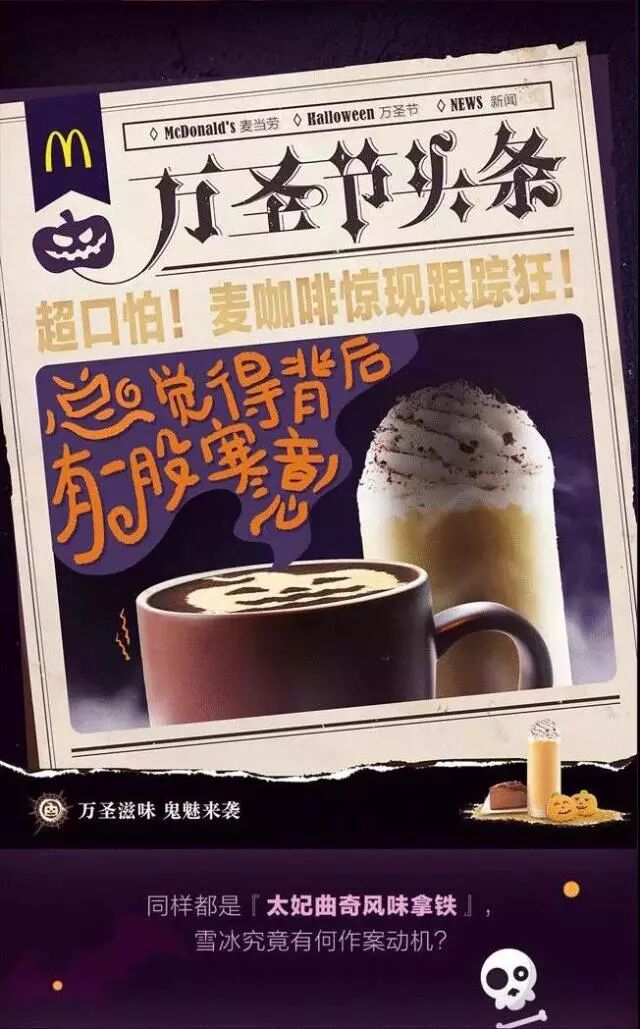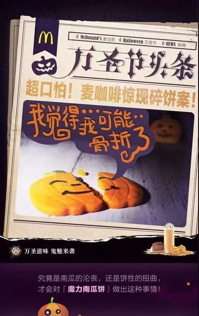 除了将重点落于“凶杀案”成功挑逗消费者的好奇心之外,这四张 “万圣节头条”海报的另外两个亮点在于:一方面,采取了富有年代感的报纸头版形式,更能增添悬疑的氛围,成功映衬了万圣节的“恐怖感”;另一方面,“凶杀案”的主角却是非人的麦当劳汉堡、饼干、咖啡和蛋糕,巧妙点出品牌的同时让人觉得萌萌的还有点无厘头,由此使消费者进一步体验到万圣节的“搞怪感”。