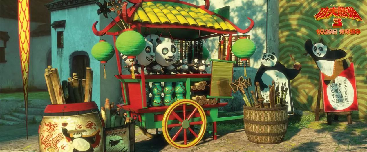 影片整体的美术风格沿用了水墨画式的构图,飞瀑直下、翠竹环绕的熊猫村与雕梁画栋的翡翠宫等中式场景建筑被经典重现,粗麻、锦缎、翡翠等服饰配饰与毽子、面条、包子等生活饮食元素都渗透着东方的审美与智慧。武学中汇聚天地玄妙的“气“也用深入浅出的东方哲学进行了重新解构。