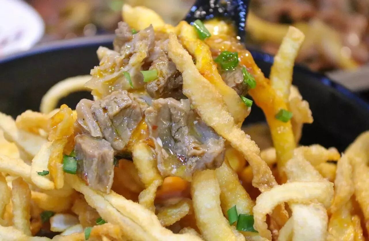 一道乐山最特色的美食,最先尝到的面食就算泡在汤里也很酥脆,好多人以为是土豆,其实是厨师们用饺子皮一块一块撵成。