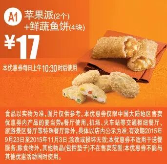 有效期:2015年9月23日起至2015年11月3日止,仅限正餐时段(10:30-23:00)使用。