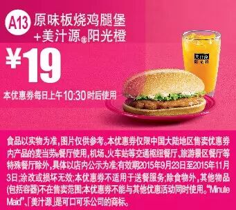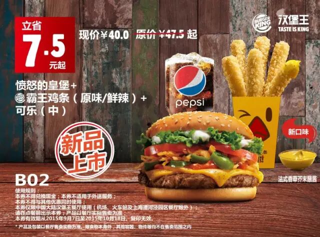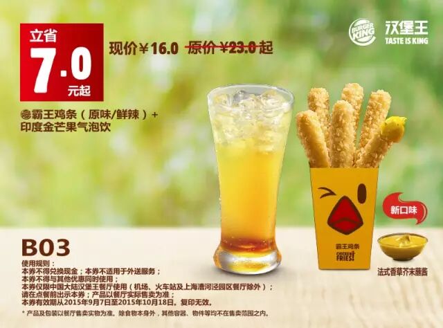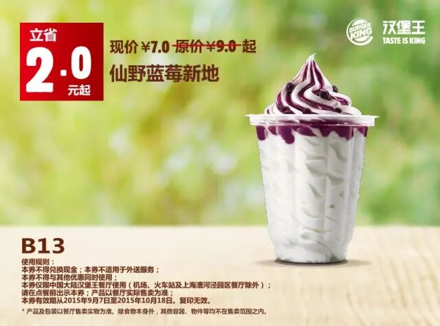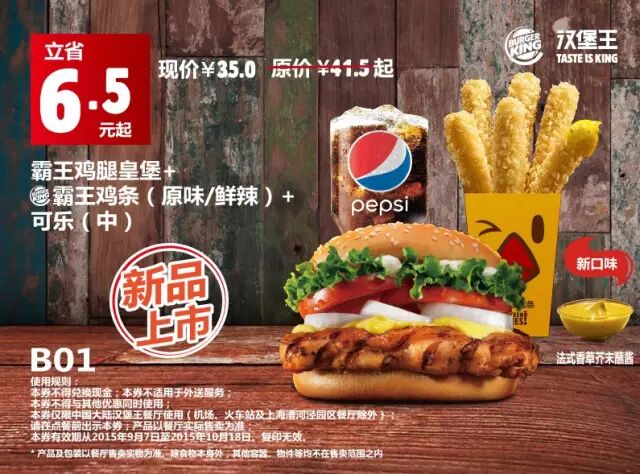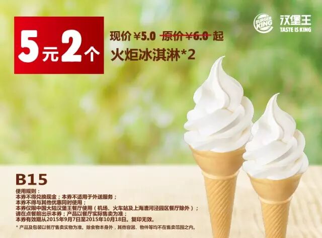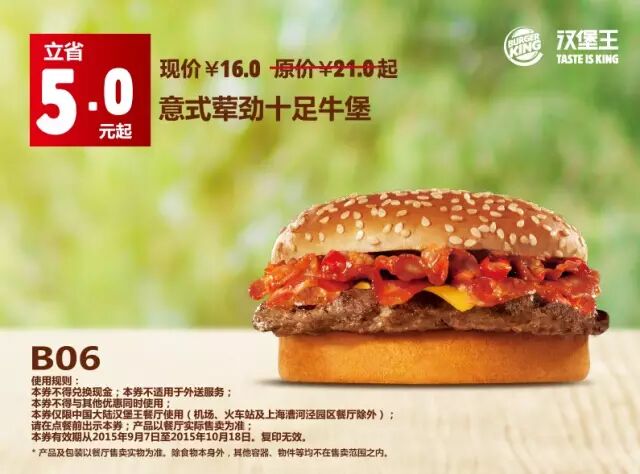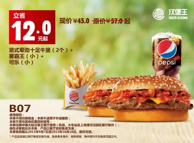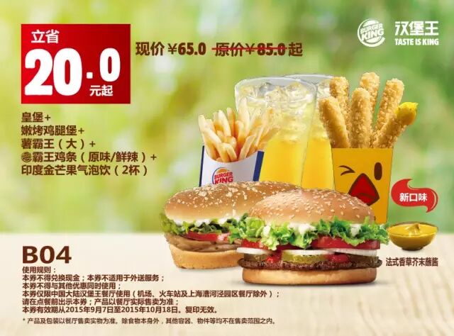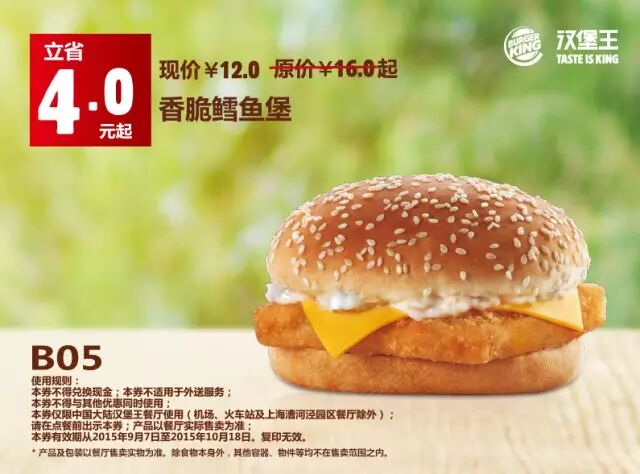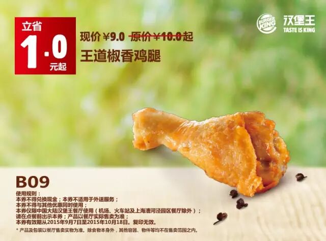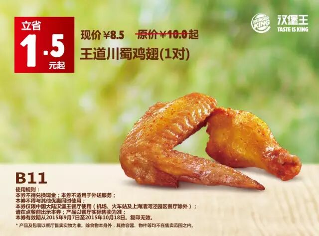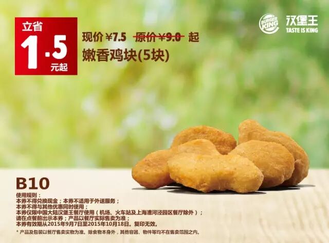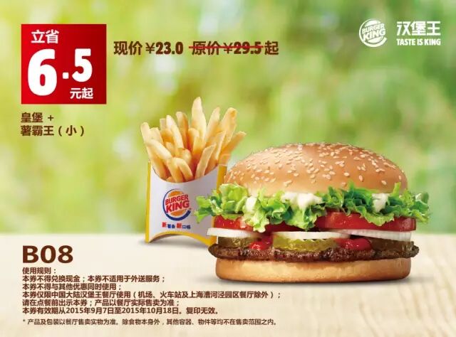 中国大陆地区汉堡王餐厅使用(机场、火车站及上海漕河泾园区餐厅除外)。请在点餐前手机出示本券,产品以餐厅实际售卖为准。有效期从2015年9月7日至2015年10月18日,复印无效。