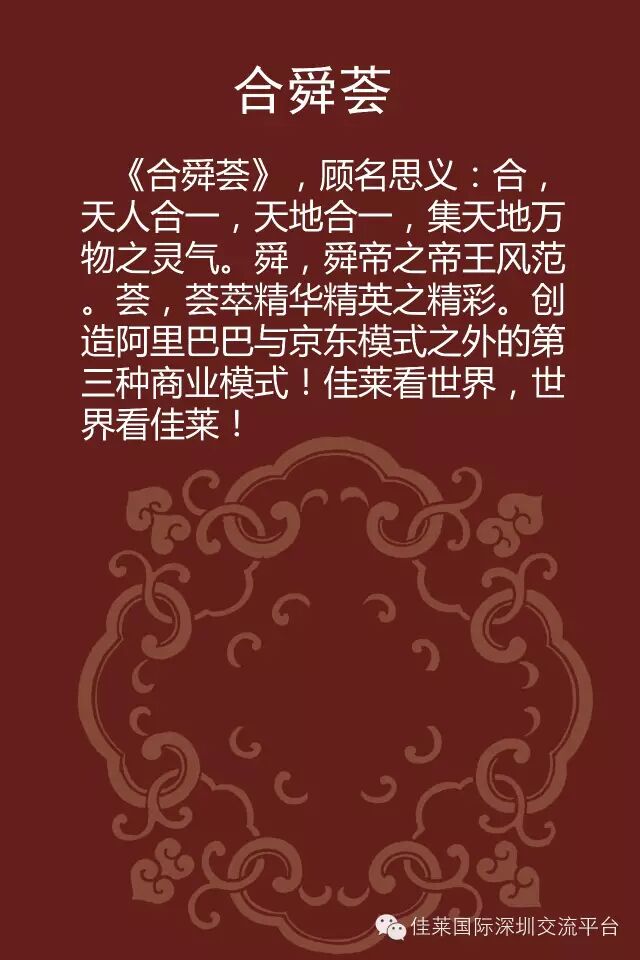 佳莱愿景: 成为第一个大健康产业的世界500强公司。弘扬中华传统文化,结合世界先进技术,成为全球最大的大健康产业第一品牌公司,成为全世界健康产业里的HERMES。