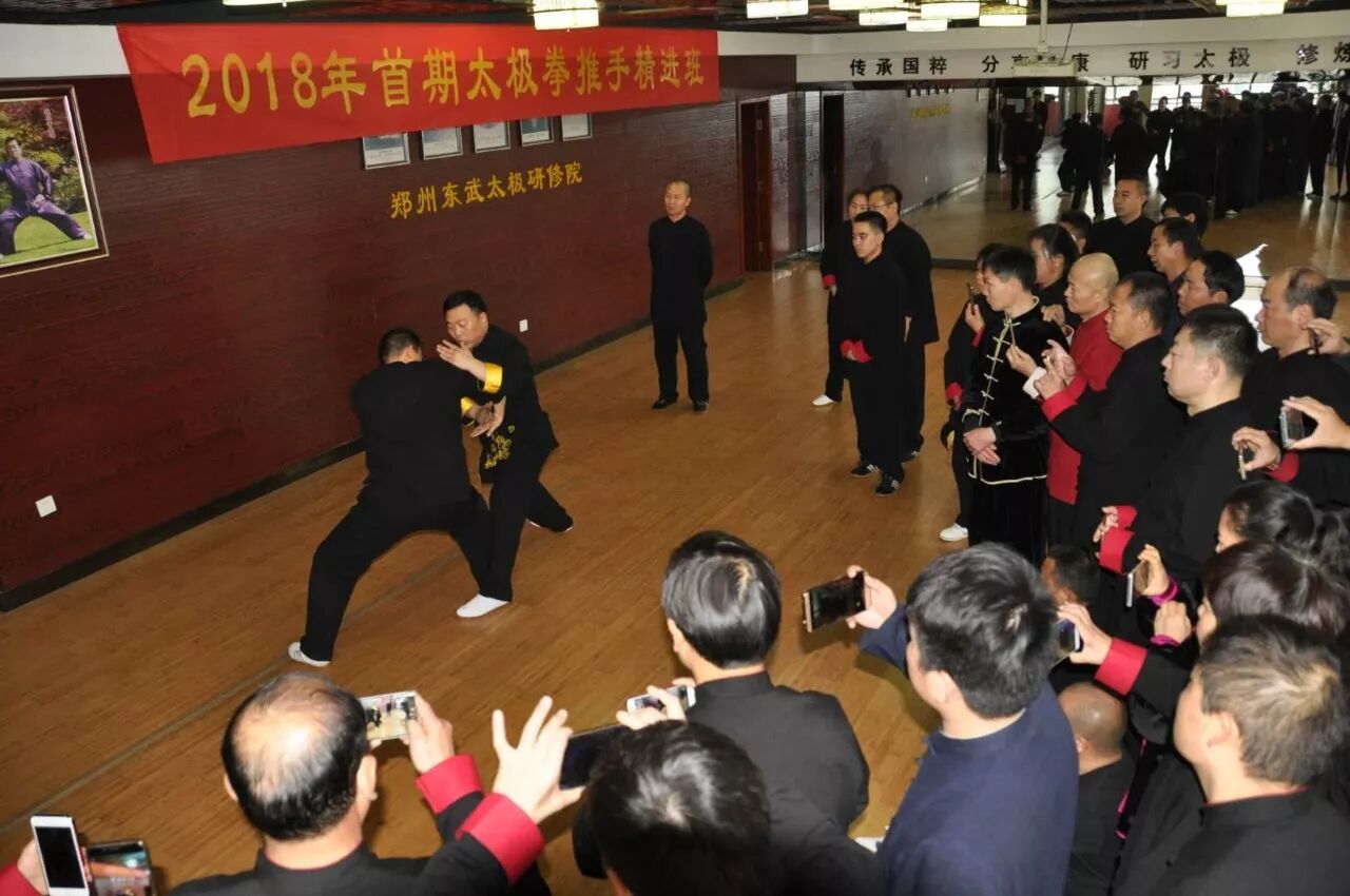 课堂上,师父反复强调化劲、听劲、领劲、肩靠劲的重要性及使用技巧,以做到知已知彼;师父的每个动作,甚至一个小小的划弧无不蕴藏着深厚的功底。教学现场时而落针可闻,时而掌声雷动,学习气氛非常浓烈。