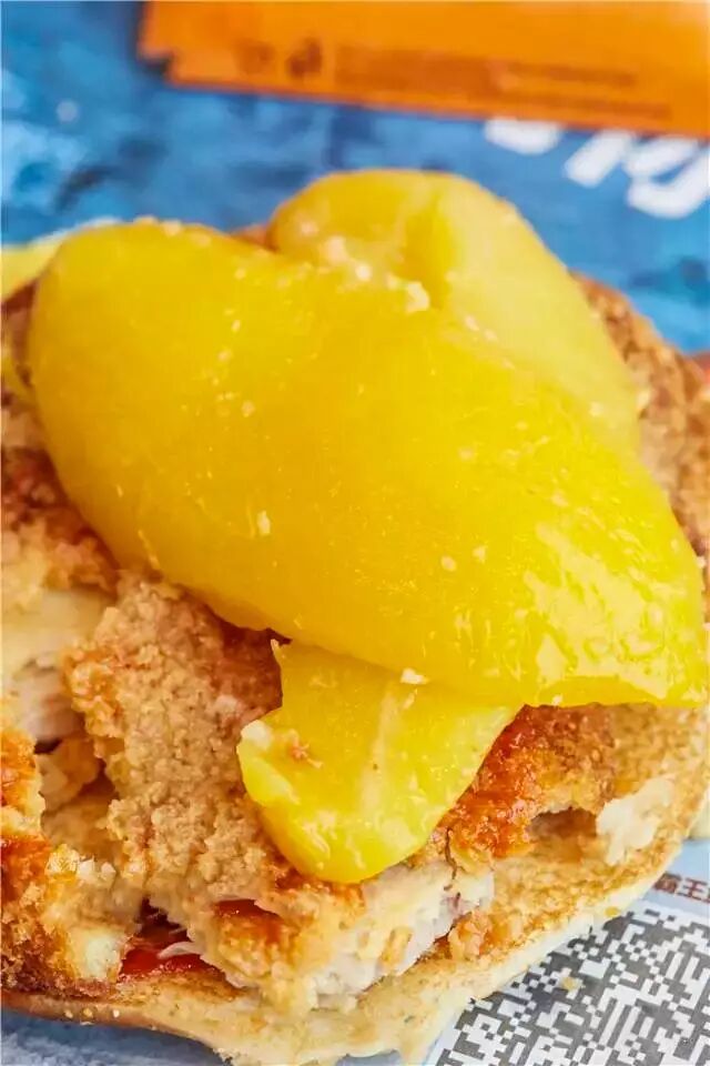 份量够够的鸡排,炸到两面金黄香脆,淋上酱料后酥脆微辣。