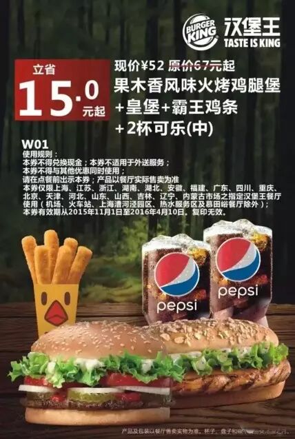 此优惠券限上海、江苏、浙江、湖南、湖北、安徽、福建、广东、四川、重庆、北京、天津、河北、山东、山西、吉林、辽宁、内蒙古市场之制定汉堡王餐厅使用(机场、火车站、上海漕河泾园区、热水服务区及慕田峪餐厅除外);