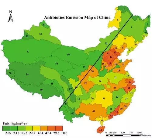 从抗生素污染地图上可以看出,在抗生素的使用上,可划分成明显的东部和西部两个部分,东部的抗生素排放量强度是西部的6倍以上。