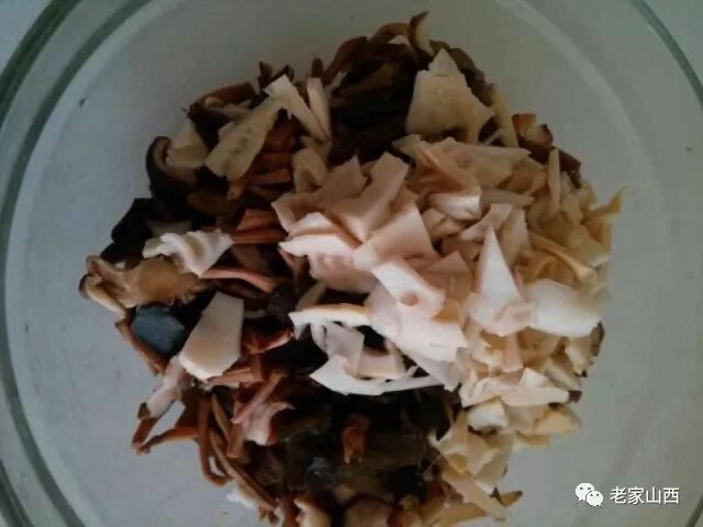 香菇、黄花菜、榛蘑、木耳头天晚上临睡前略冲洗,分别泡清水发上。