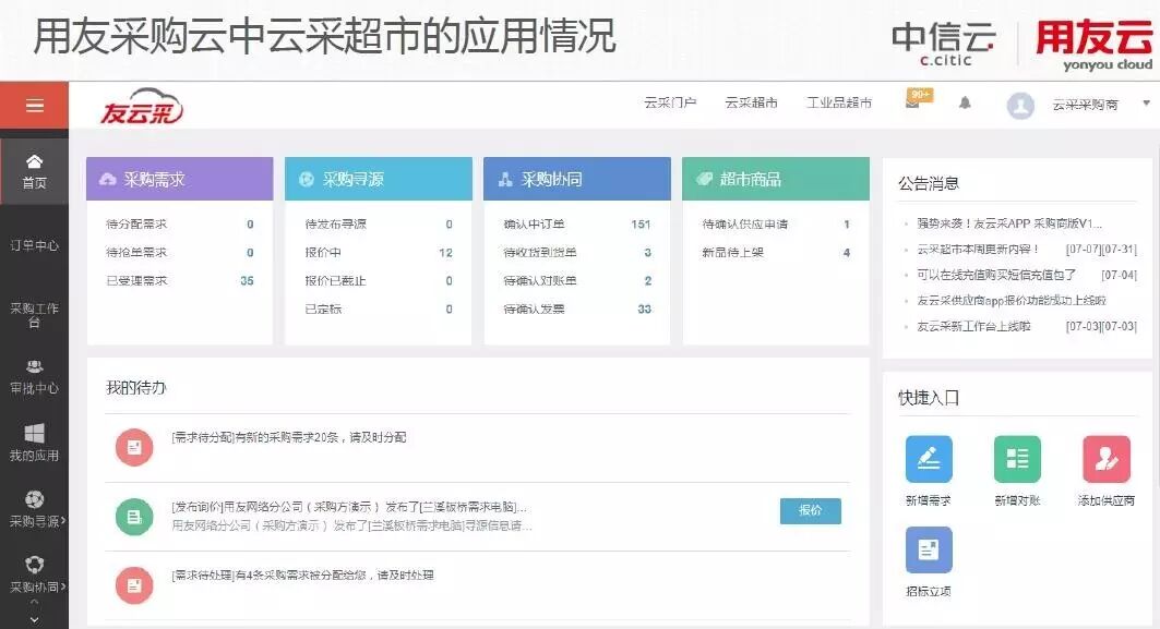目前,中信云基于和友云采的融合,以及与中信支付的打通,建立起中信集采平台,提供采购寻源、招投标、供应商管理、超市采购等采购各个环节的全流程服务。
